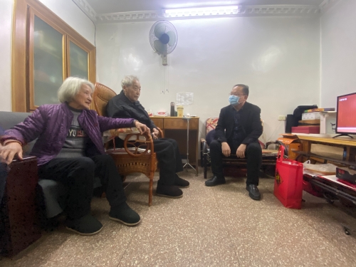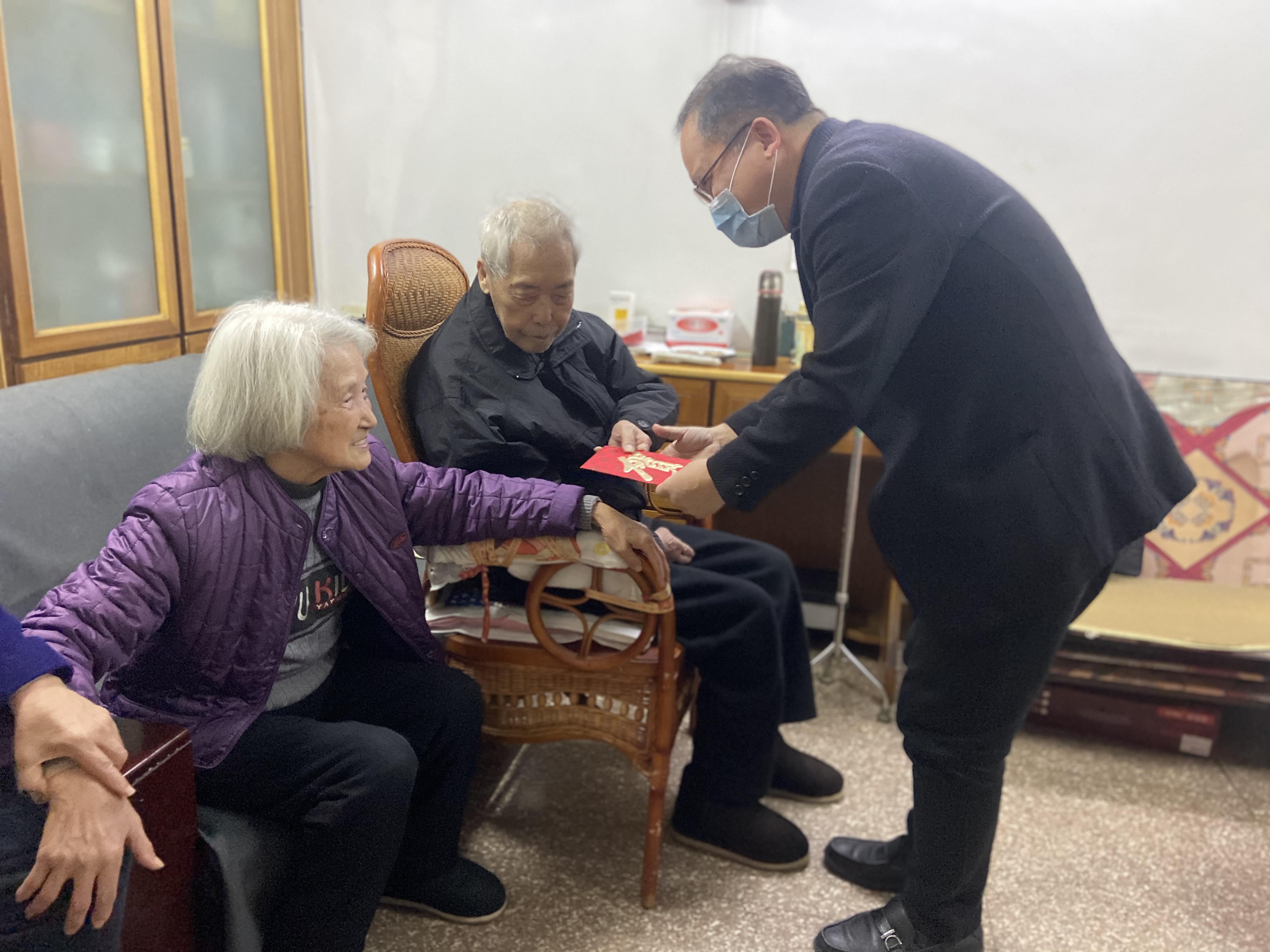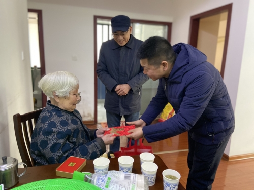 在新春佳节来临之际,温州市教育局党委委员、副局长伍挺、纪检书记李志坚、监察室主任翁旭凤、人事处处长陈炜,杨丽琴、张仁杰一行在温州二职党总支书记马仲庆、执行校长蔡克全的陪同下,分别带队走访慰问生活困难的退休老党员杨显玉和钱锦衣,为她们送去慰问金,并致以亲切问候和新春祝福。