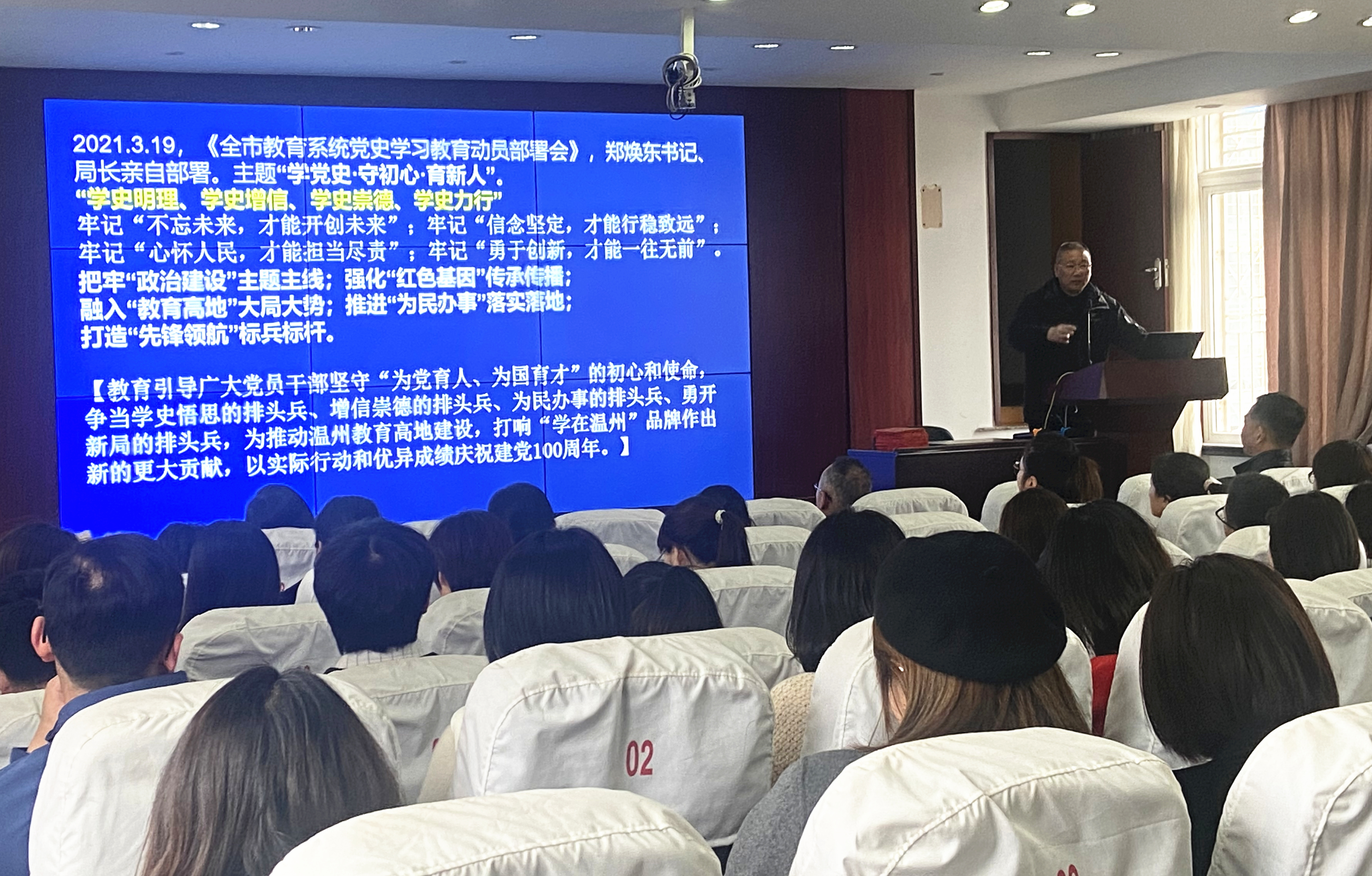 蔡克全执行校长以中央提出的“学史明理、学史增信、学史崇德、学史力行”为主题,教育引导广大党员干部要坚守“为党育人、为党育才”的初心和使命,争当学史悟思的排头兵、增信崇德的排头兵、为民办事的排头兵、为推动温州教育高地建设、打响“学在温州”作出新的更大贡献,以实际行动和优异成绩庆祝中国共产党成立100周年。