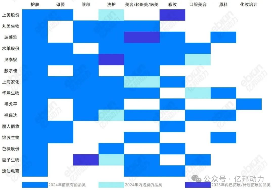 这些品牌以核心业务为根基,不断延伸触角,多品类、跨赛道布局。国货龙头主要集中在护肤品领域,2024年以来重点发力重组胶原蛋白等产品,同时向彩妆、香水、洗护和婴童护肤等品类拓展。