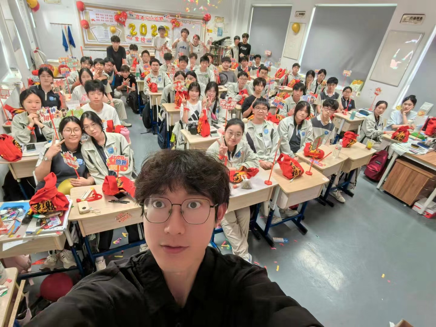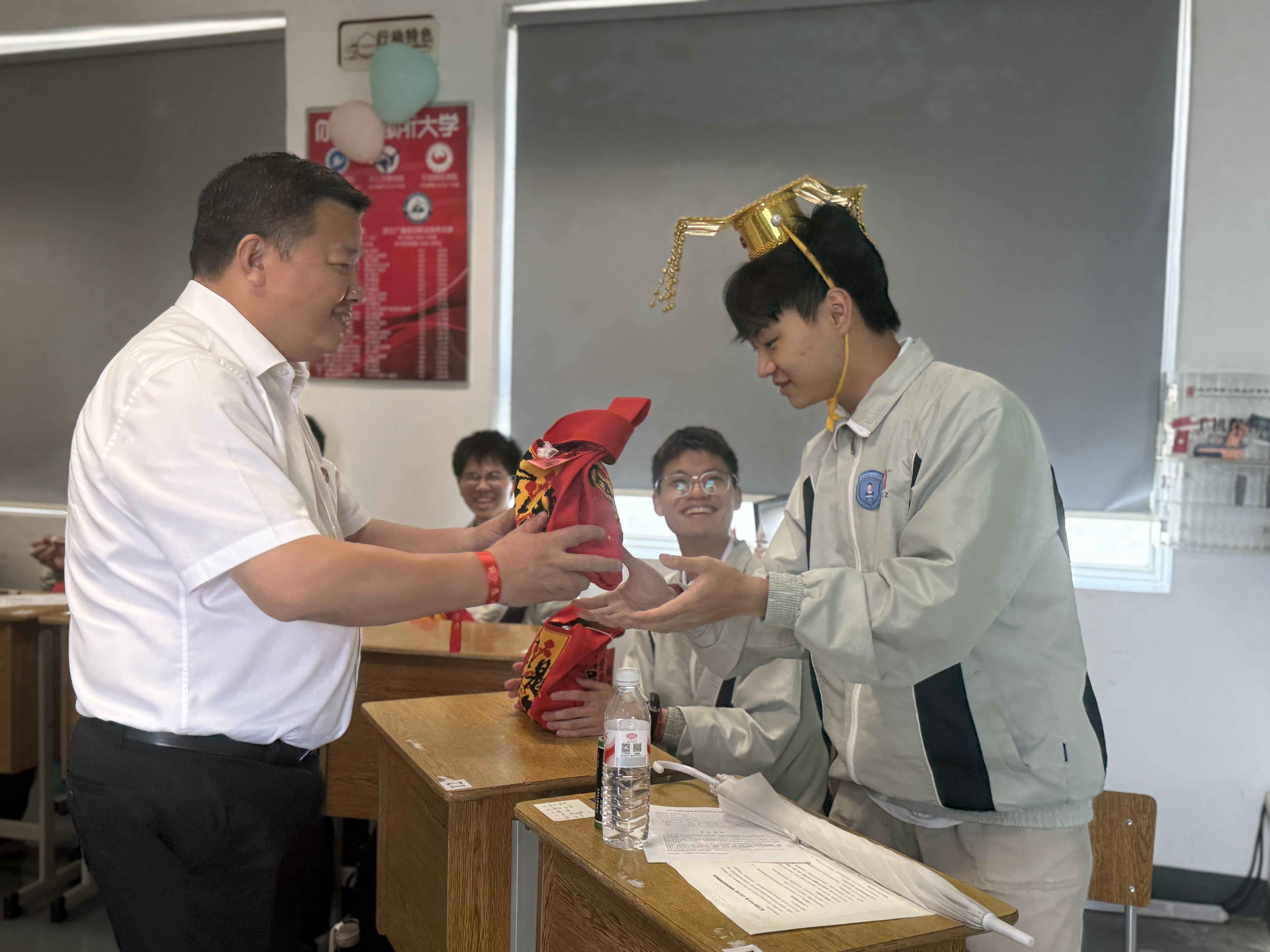 祝福送达的瞬间,温情在校园里流淌。校长与书记亲自带队,将满载心意的礼包送至高三每个班级。他们亲手递上祝福,亲切寄语,每一句“沉着应考”“心想事成”都饱含深情与信任,传递着学校对学子最深切的关怀与支持,点燃了教室里的掌声与感动。