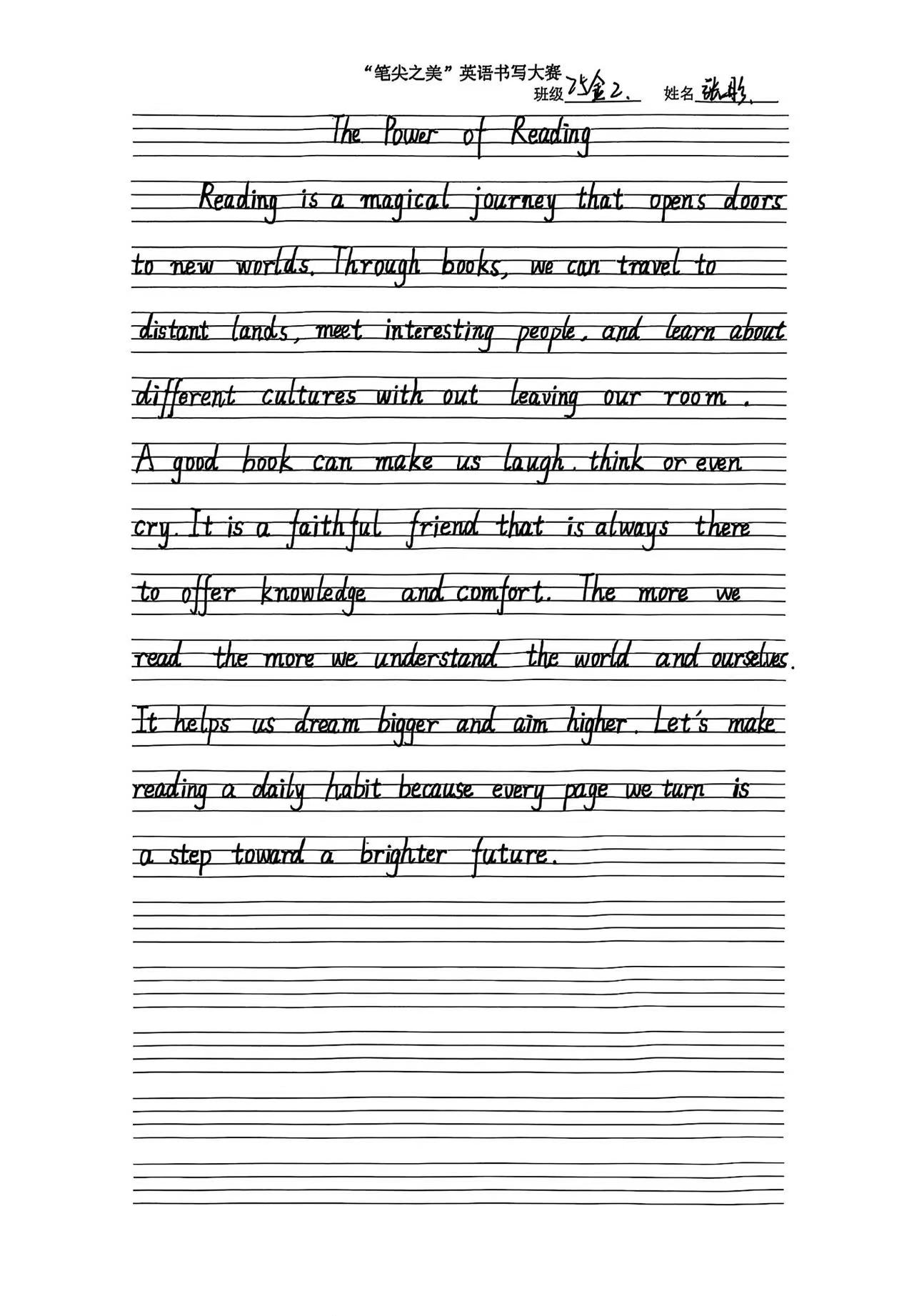 通过竞赛形式,促使学生重视英文书写,在日常学习中养成良好书写习惯。为学生提供一个展示个人书写才华的平台,增强学习英语的自信心与成就感。在全校范围内掀起“练好基本功,书写优美英文”的热潮,促进严谨、细致学风的形成。
