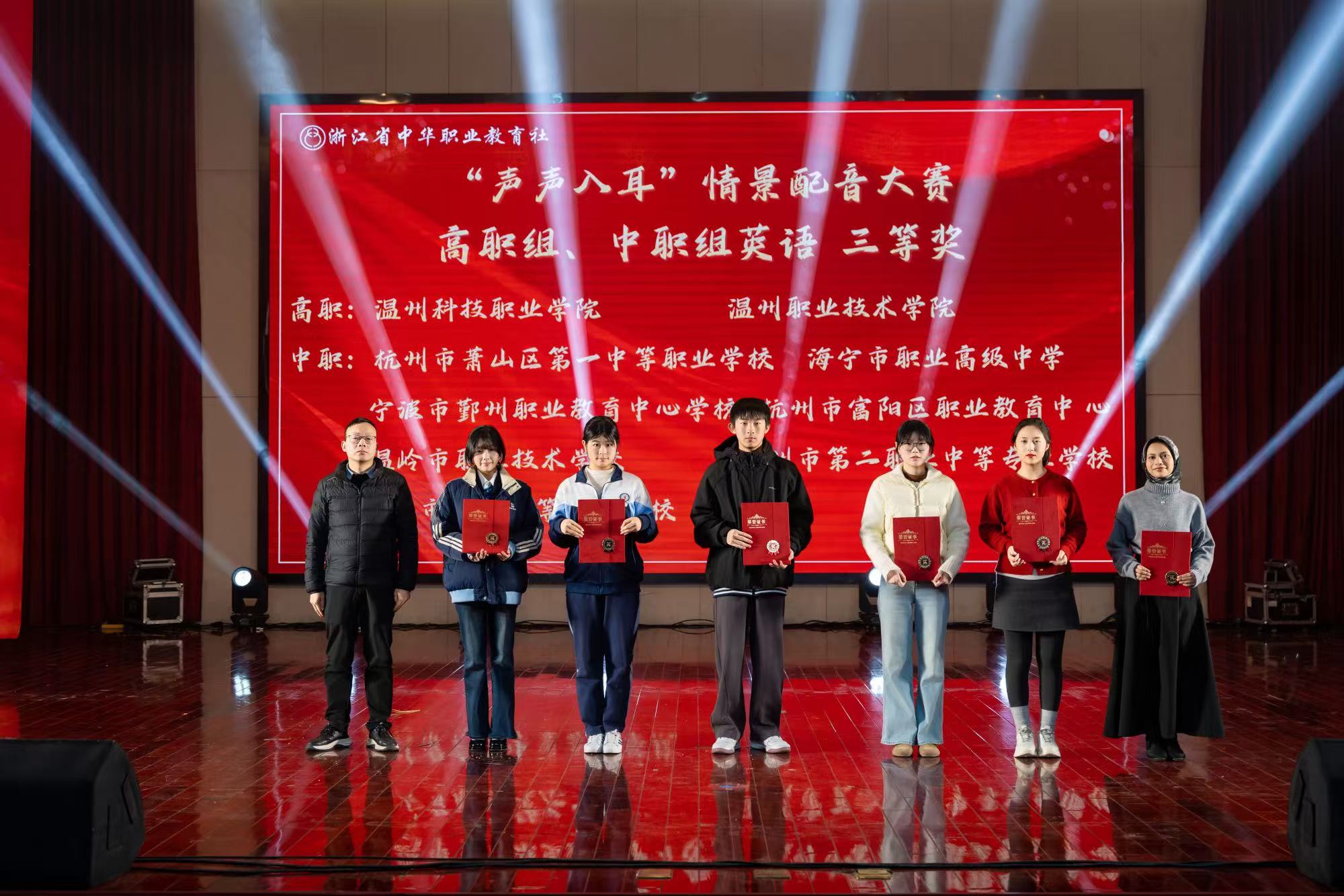 近日,2025年浙江省职业学校“声声入耳”外语情景配音大赛圆满落下帷幕。经过激烈角逐,我校25数字影像中本班顾浩珏、刘皓源、王宸妤、王一诺、潘姿逸五位同学组成的团队凭借出色的语言表现力、生动的角色塑造和默契的团队协作,在众多参赛队伍中脱颖而出,荣获省级三等奖,展现了我校学子扎实的外语素养与昂扬的青春风采。